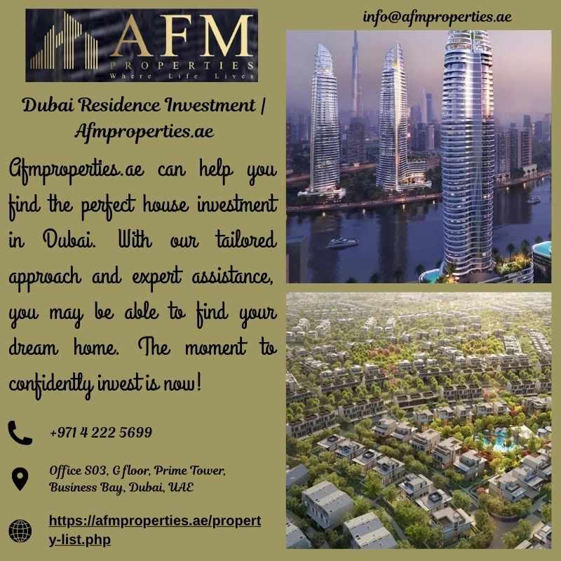 With the help of Afmproperties.ae, find the greatest real estate in Dubai. It's easy to invest in Dubai with our knowledgeable staff and comprehensive listings. Now is the time to invest with confidence!